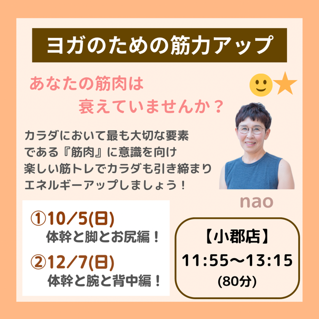 2025.09.22 小郡店 イベント 【2025.10~12月特別クラス】小郡店 ヨガのための筋力アップ nao \\2025年10月・12月特別クラス// ★★ヨガのための筋力アップ nao★★ 【小郡店】 10月5日・12月7日 日曜日 11:55~13:15(80分) 〇初級Ⅰ・Ⅱ ☺★ nao先生と楽しく筋トレしましょう!