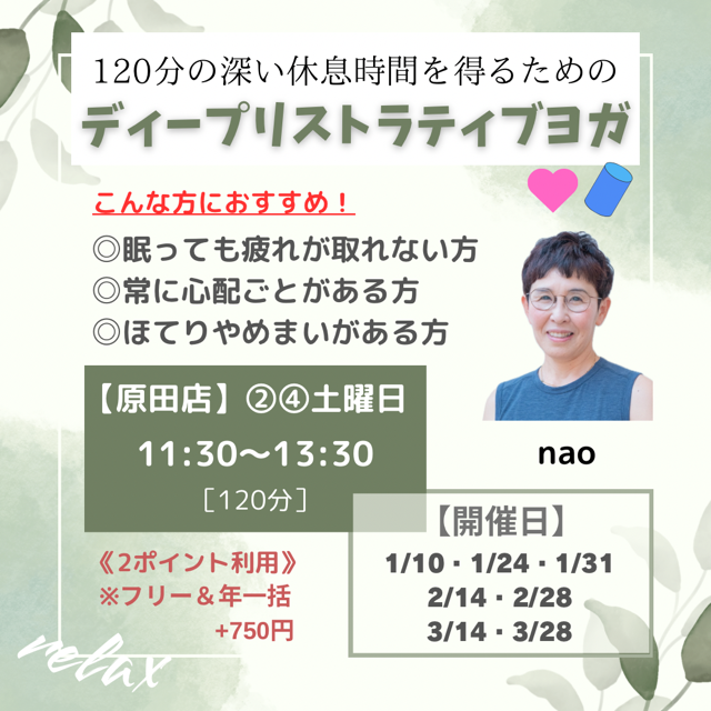 2025.12.15 原田店 イベント 【2026.1~3イベント】原田店 第2.4㊏ ディープリストラティブヨガ nao \\2026年1~3月イベントクラス// ★★ディープリストラティブヨガ nao★★ 【原田店】第2・4・5土曜日 11:30~13:30(120分) ◎リラクゼーション 💗 ◎ストレッチポール使用 ◎2ポイント (フリー&年一括 +750円) 疲れがたまって取れない方 ぜひお待ちしております!