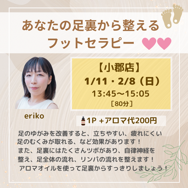 2025.12.15 小郡店 イベント 【2026.1~3特別クラス】小郡店 あなたの足裏から整えるフットセラピー eriko \\2026年1~3月特別クラス// ★★あなたの足裏から整えるフットセラピー eriko★★ 【小郡店】 1月11日・2月8日 日曜日 〇13:45~15:05(80分) 〇リラクゼーション ❤❤ 〇オイル代200円 (NCAオイルをお持ちの方は不要) 〇ゆったりとしたボトムを着用し バスタオルと靴下をお持ちください